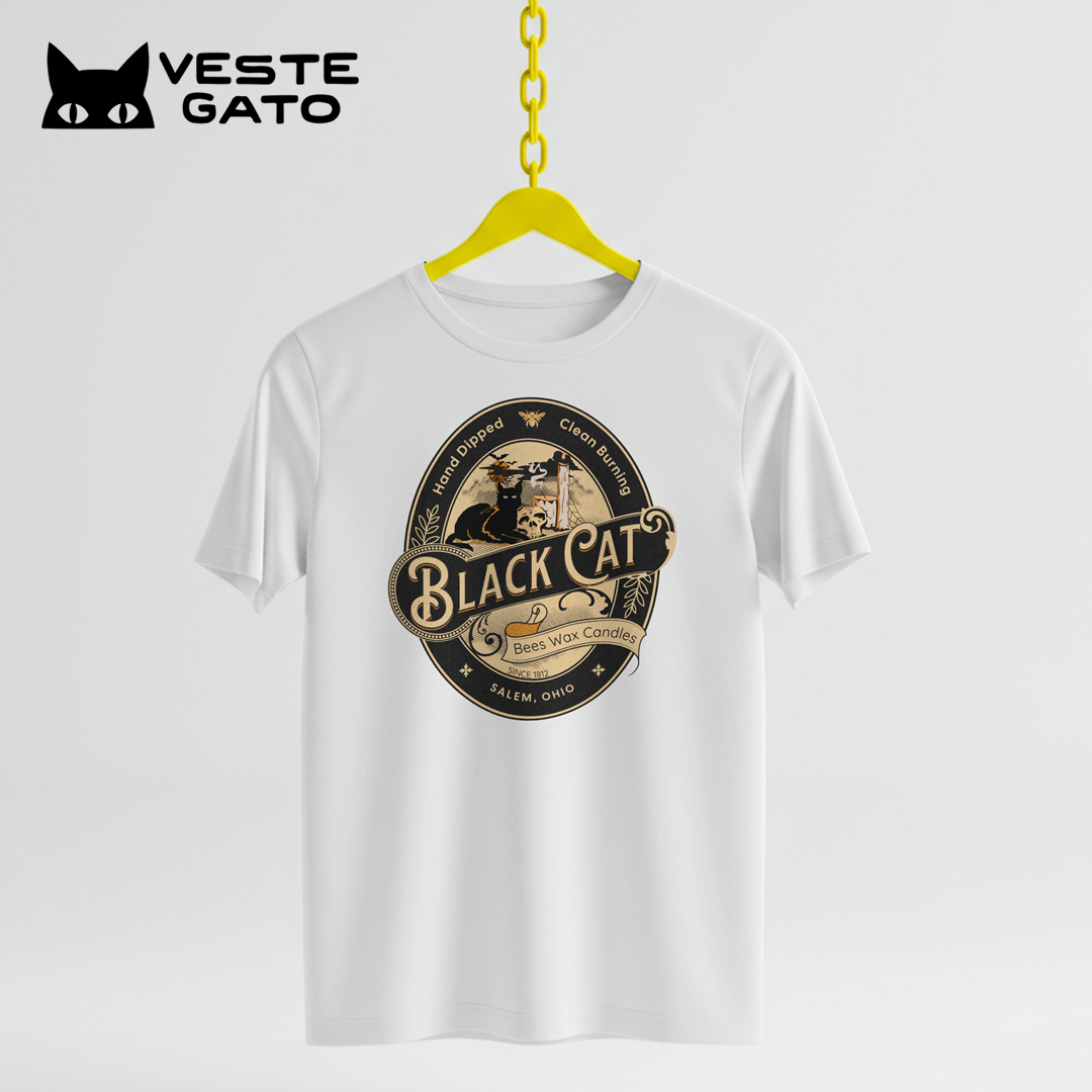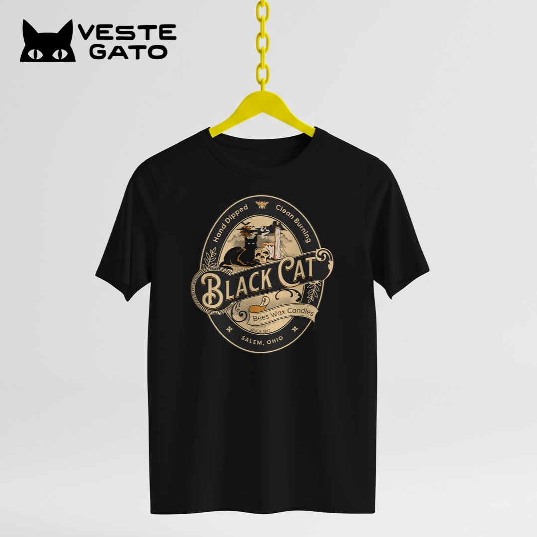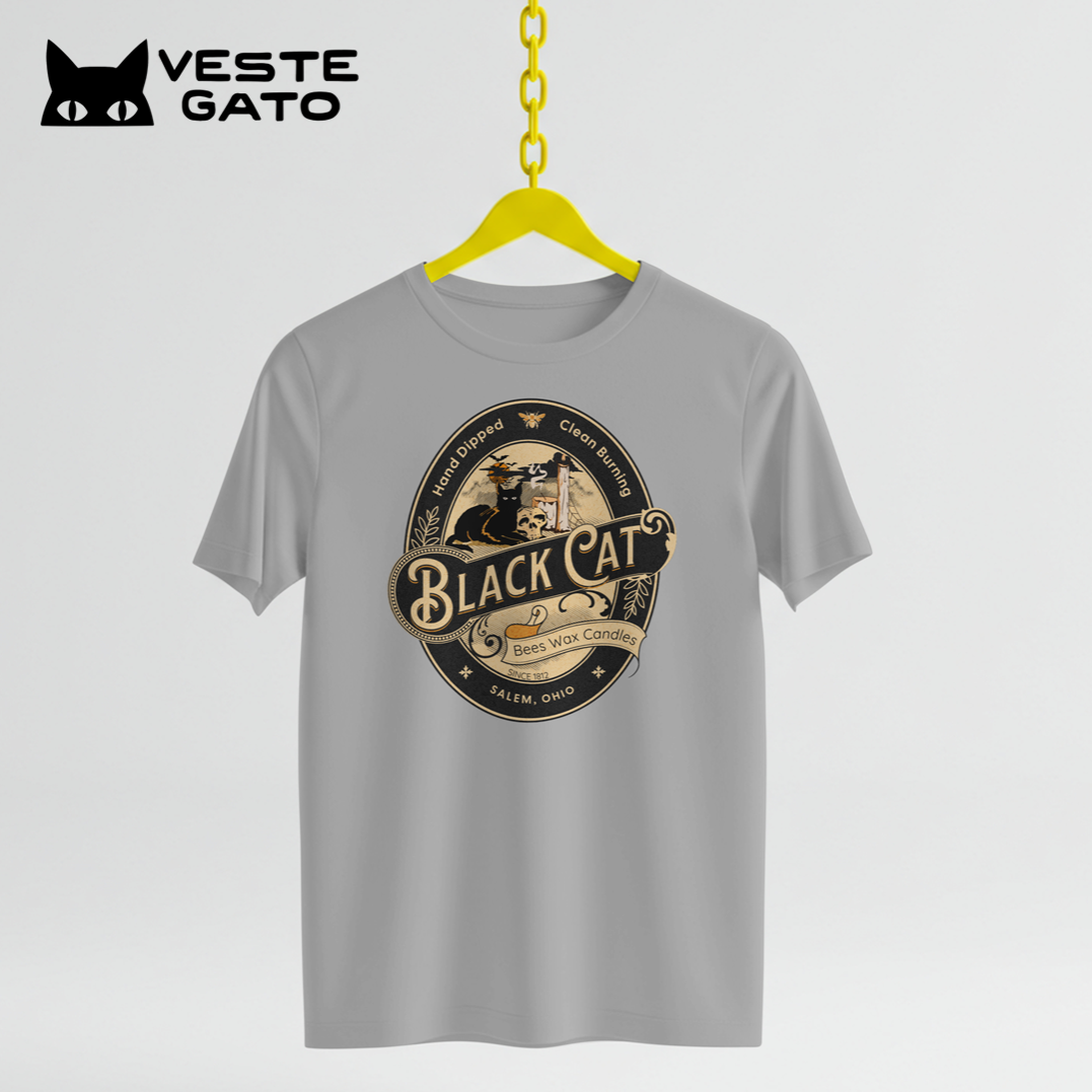 Um gato preto místico rodeado de velas de cera de abelha — charme e mistério em uma estampa.