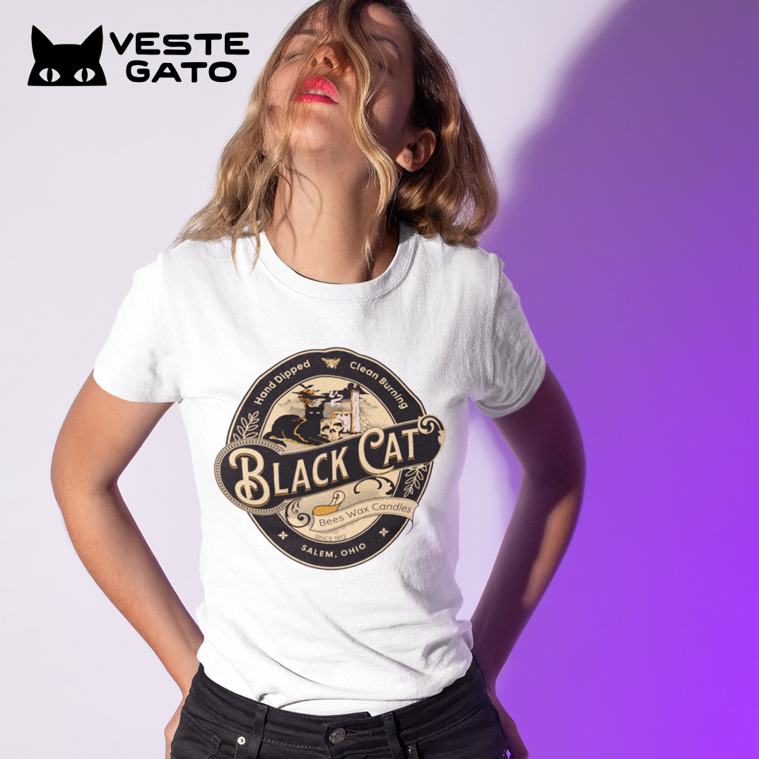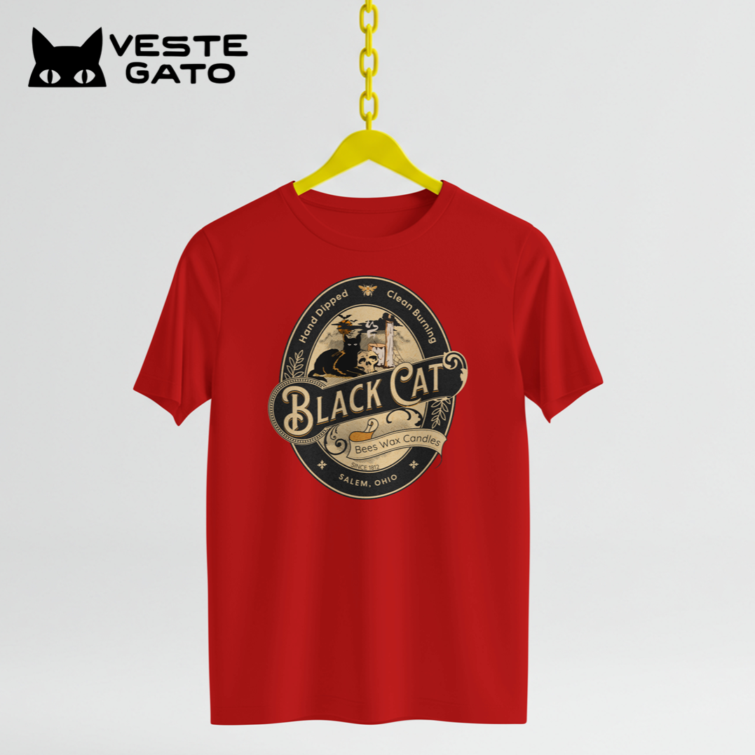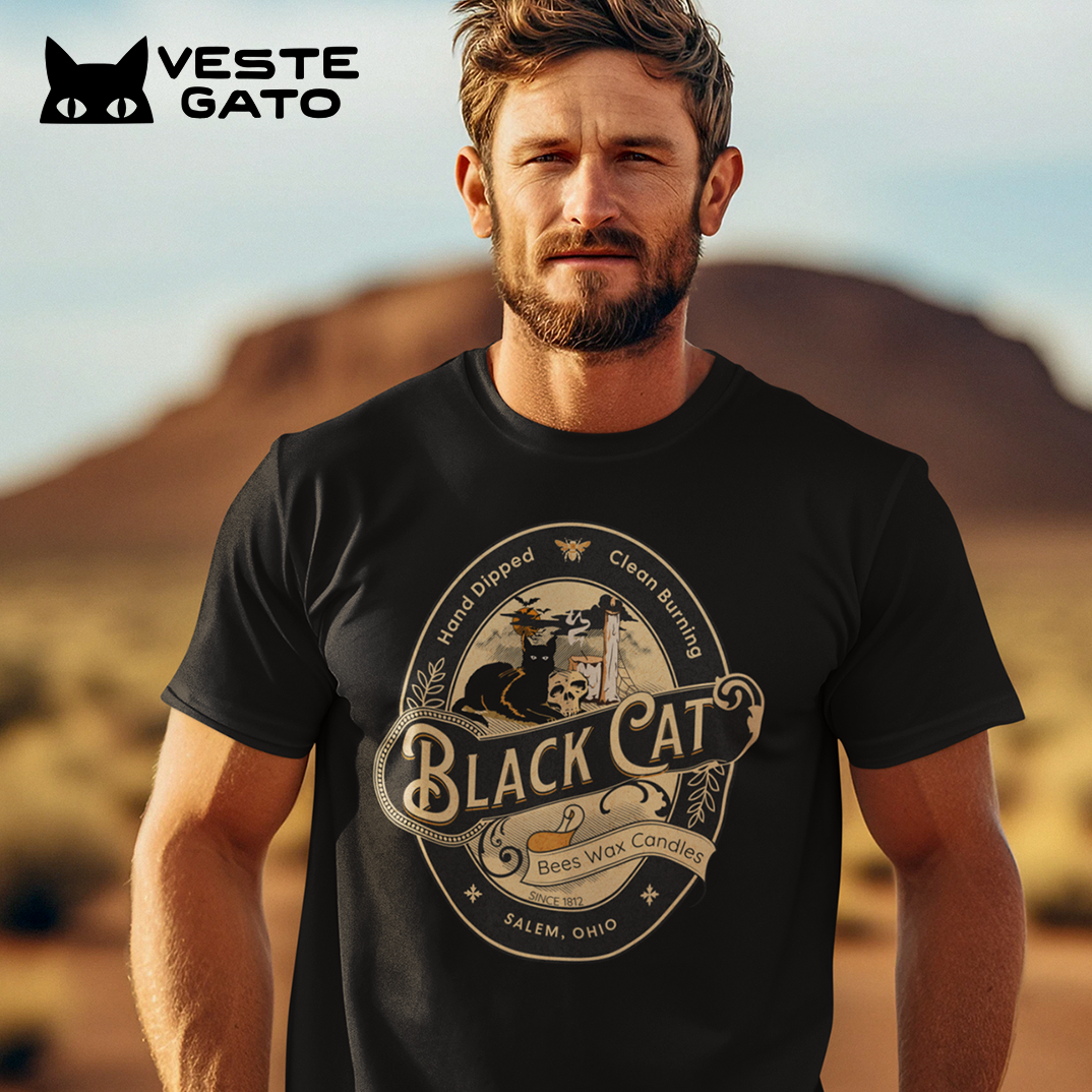Um gato preto místico rodeado de velas de cera de abelha — charme e mistério em uma estampa.