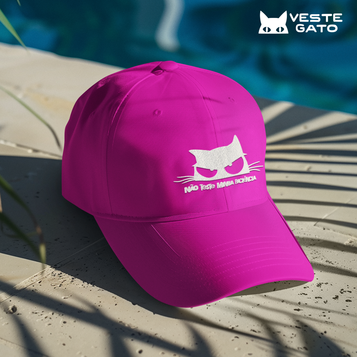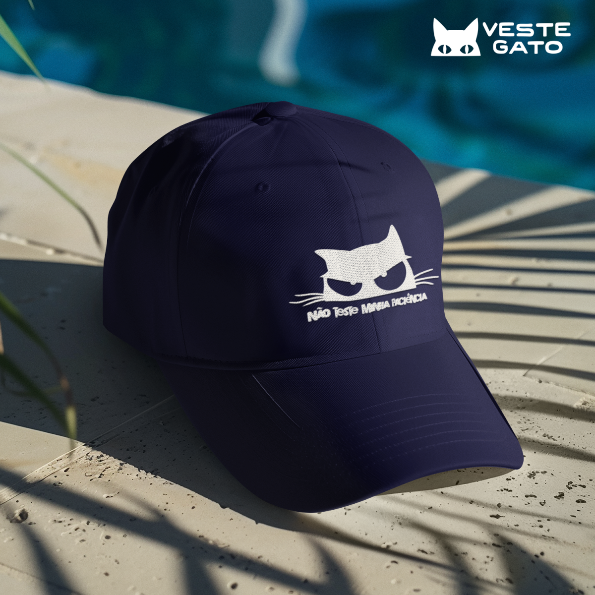 Boné um gato bravo com cara de poucos amigos — puro humor felino.