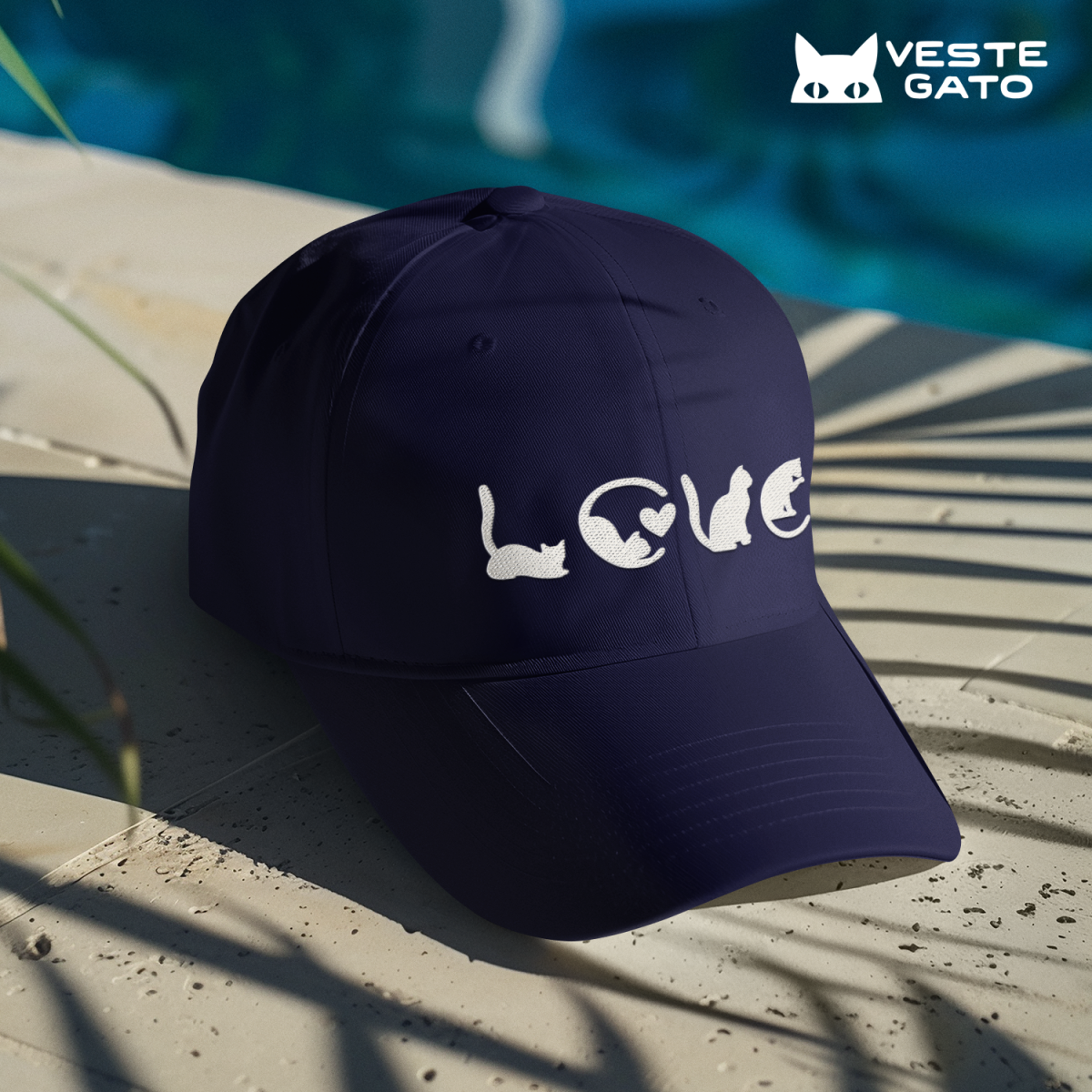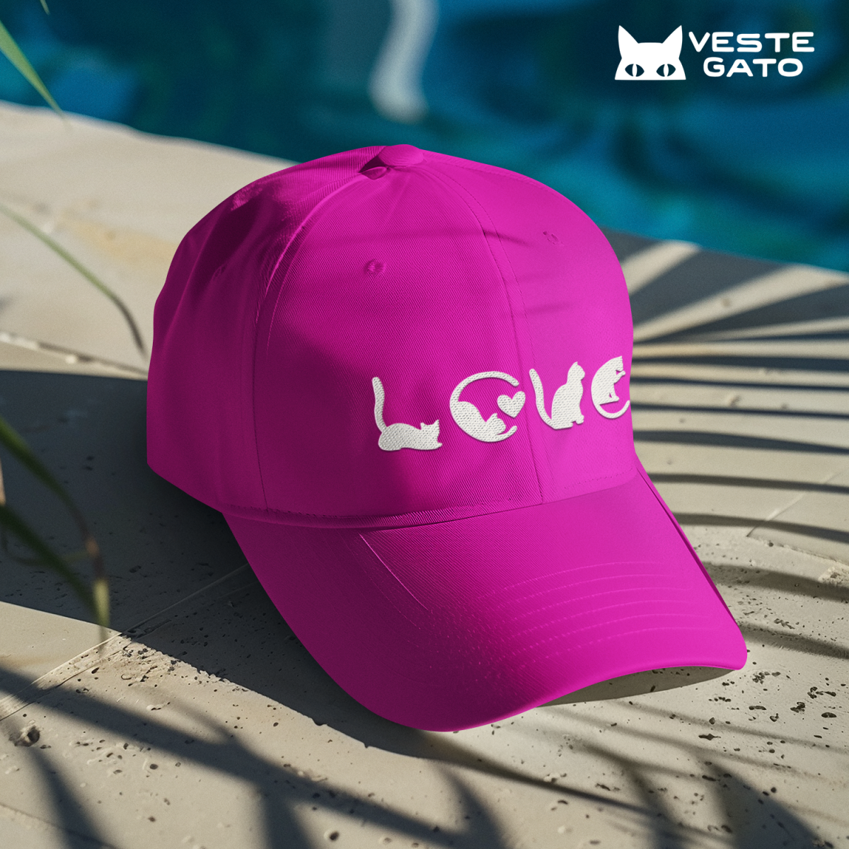 Boné com a palavra LOVE em forma de gato — perfeita para os apaixonados por felinos.