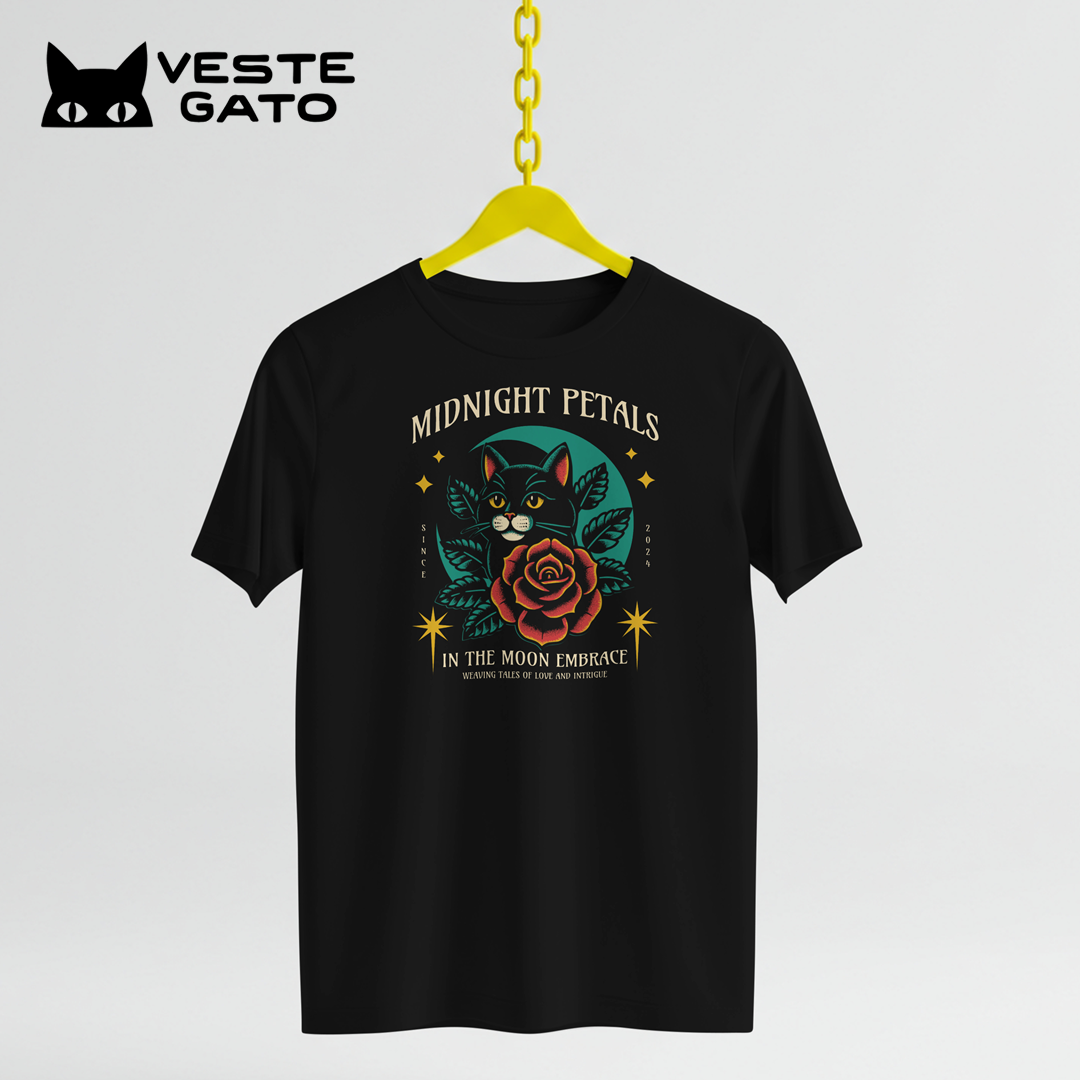 Uma mistura de elegância noturna e delicadeza floral, com toque felino.