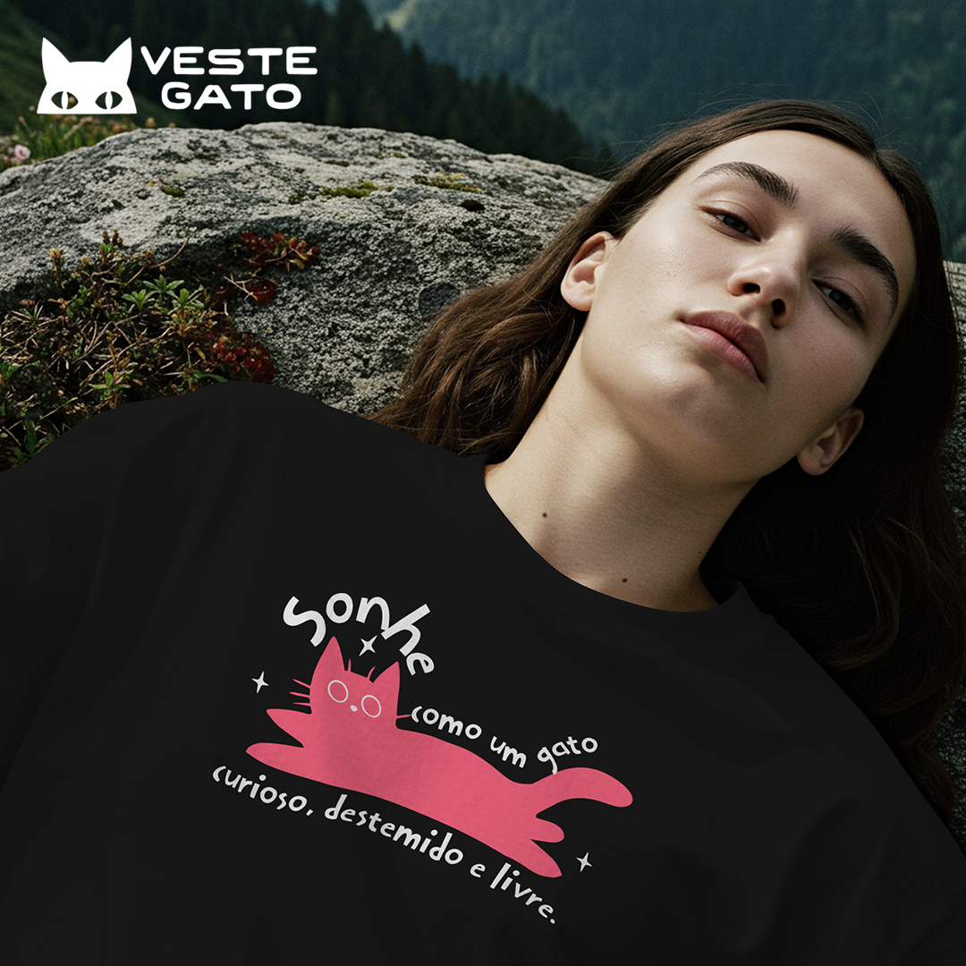 Uma estampa divertida e inspiradora — sonhar é o que os gatos fazem de melhor.